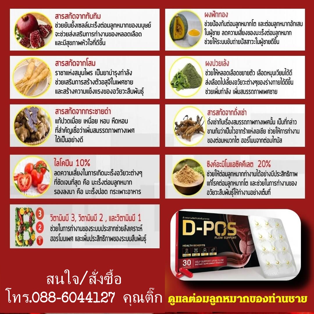 ดี-โพส D-POS เป็นผลิตภัณฑ์ที่มีส่วนประกอบของไลโคปีน (Lycopene) ซึ่งเป็นสารสีแดงที่มาจากมะเขือเทศจะทำหน้าที่ป้องกันการเสื่อมสภาพของเซลล์และจากการศึกษาของ Giovannucci E และคณะในปี 2002 เกี่ยวกับสาร ไลโคปีน และความเสี่ยงในการเกิดมะเร็งต่อมลูกหมากพบว่า ไลโคปีนสามารถลดความเสี่ยงในการเกิดมะเร็งต่อมลูกหมากได้จริง นอกจากงานวิจัยชิ้นนี้แล้วก็ยังมีงายวิจัยอีกหลายๆชิ้นที่ให้ผลคล้ายคลึงกันที่ว่าสามารถลดความเสี่ยงในการเกิดมะเร็งต่อมลูกหมากได้ และยังมีสารสกัด Pomegranate Extract สารสกัดจากทับทิม ที่มีงานวิจัยที่พบว่าช่วยยับยั้งเซลล์มะเร็งต่อมลูกหมาก ในผลิตภัณฑ์ยังประกอบด้วยซิงค์ออกไซด์ที่เป็นส่วนสำคัญช่วยให้ต่อมลูกหมากทำงานได้อย่างมีประสิทธิภาพแก้โรคต่อมลูกหมากโต และช่วยในการทำงานของอวัยวะสืบพันธุ์ให้ทำงานอย่างเต็มที่ และยังช่วยในการเสริมสร้าง บำรุงสมรรถภาพในเพศชาย ให้มีพลังและตื่นตัว และมีสมรรถภาพที่ดีขึ้น